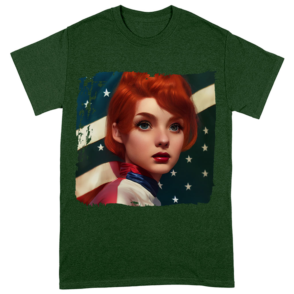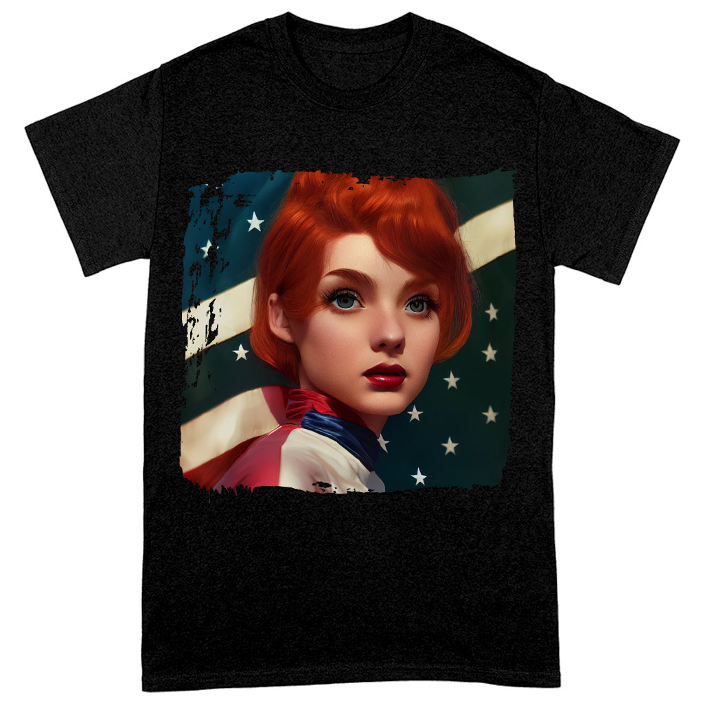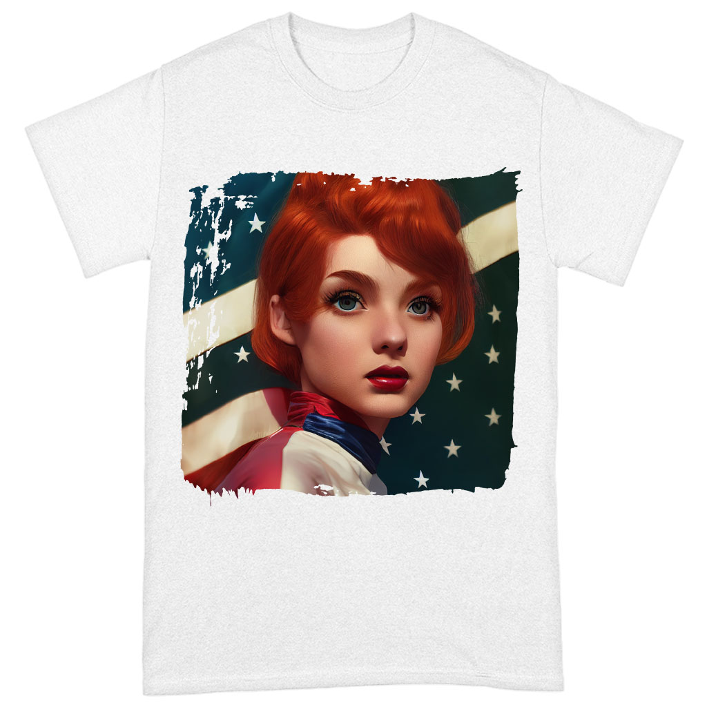 Unisex Girl Red Hair American Flag Heavy Cotton T-Shirt – Art Tee Shirt – Cool T-Shirt